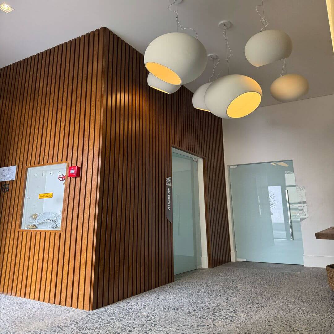 Painel ripado com design aprimorado, acabamento sofisticado e estrutura durável em PVC com revestimento melamínico. Ideal para ambientes internos e externos que exigem um visual elegante.